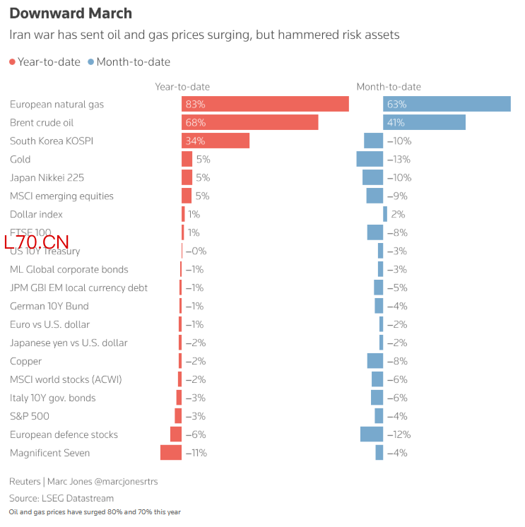 美国3月消费者信心降幅超预期,德国投资者信心大幅恶化,标普全球3月欧元区与美国采购经理人指数(前瞻性商业活动指标)均创数月新低。分析师认为,尽管美国经济韧性较强、且为能源出口国,但若冲突持续推高能源价格,美国经济仍将受到冲击。经合组织上周四警告,全球经济已偏离原本更强劲的增长轨道。