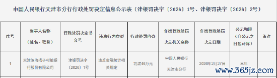 天津滨海扬子村镇银行被罚40万元:违反金融统计相关规定