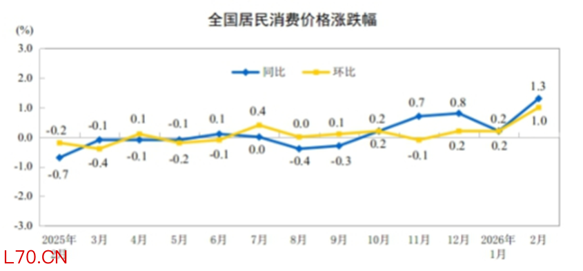 3月9日国家统计局公布,2月份,全国居民消费价格(CPI)同比.上涨1.3%,同比增幅创下3年新高。2月份,全国工业生产者出厂价格(PP1)同比下降0.9%,降幅比上月收窄0.5个百分点。