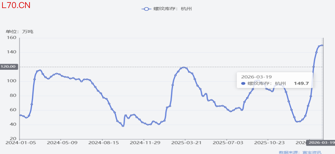 3月20日,周四杭州螺纹库存149.5万吨,螺纹出库3.4万吨。农历同比去年库存117.8万吨,去年出库4.2万吨。前2年垒库高度都在120万吨上方一点,今年直接150万吨了。日出库数据来看,出库与去年相差无几。如后续出库数据没有改善,可能会给价格带来承压。