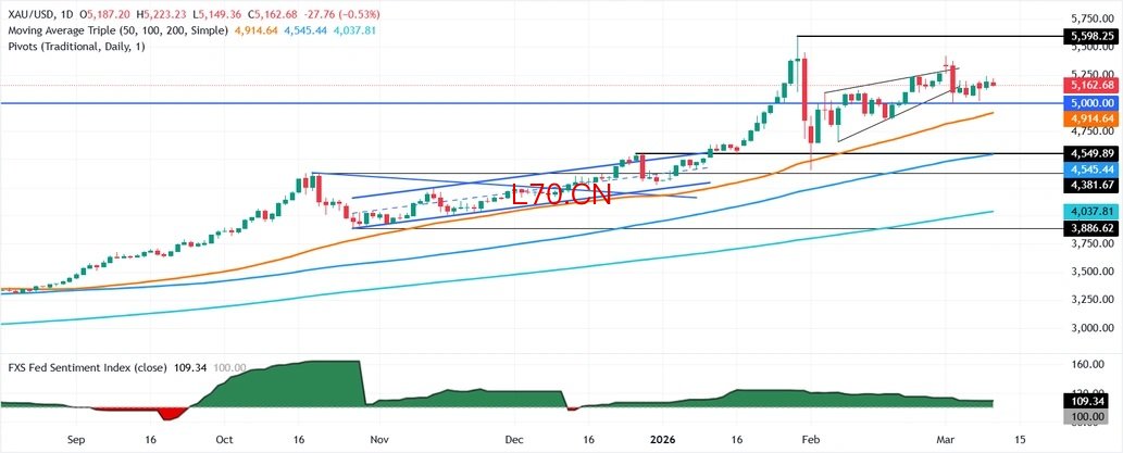 Valencia补充道,反之,如果金价跌破5100美元/盎司,则可能挑战关键支撑位,包括3月9日的日内低点5014美元/盎司,以及50日简单移动平均线(SMA)4896美元/盎司。